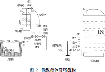 3、液氮管路流程。液氮管路流程用于向試驗裝置加注低溫液體冷卻劑液氮,其流程如圖2所示。