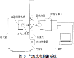 測試系統(tǒng)的臺架總體結(jié)構(gòu),包括儀表面板(垂直面)、閥門面板(傾斜面)、儀器架和氣泡光電檢漏系統(tǒng)等部分。儀表面板上包含電源開關(guān)/指示器、指針式精密壓力表、數(shù)字式壓力表、溫度數(shù)顯儀和試驗時間計時器等。氣泡光電檢漏系統(tǒng)的原理性示意圖如圖3所示。