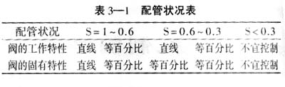 調(diào)節(jié)閥總是與管道、設(shè)備連在一起使用的,管道阻力的存在必然會(huì)使閥的工作特性與固有特性不同。所以,應(yīng)根據(jù)對(duì)象的特性,選擇合適的工作特性,再根據(jù)配管情況選擇相應(yīng)閥的固有流量特性。考慮工藝配管情況時(shí),可參照表3-1來選擇閥的固有特性。