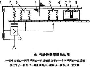 由于負(fù)反饋力矩比線圈產(chǎn)生的測量力矩大得多,因而設(shè)置了正反饋波紋管,負(fù)反饋力矩減去正反饋力矩后的差就是反饋力矩。調(diào)零彈簧用來調(diào)節(jié)輸出氣壓的初始值。如果輸出氣壓變化的范圍不對,可調(diào)永久磁鋼的分磁螺釘。