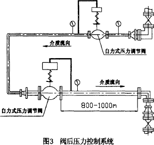 控制系統(tǒng)為穩(wěn)定閥后壓力的系統(tǒng),介質(zhì)為氮?dú),系統(tǒng)的初始管道壓力為2800KPa,后工段所需要的最大流量為2000NM3/h。工藝要求是后工段使用介質(zhì)10分鐘后停止使用1小時(shí),并按此方式循環(huán)使用;正常使用時(shí)閥后壓力穩(wěn)定在700KPa,停止使用時(shí)閥后壓力不得高于800KPa。閥后輸送管道長度為800∼1000米左右(如圖3所示)。