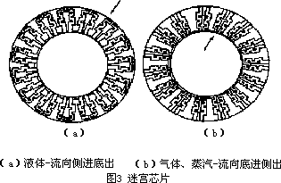 圖3中所示液體的流向?yàn)閭?cè)進(jìn)底出,而氣體和蒸汽則相反為底進(jìn)側(cè)出。這是因?yàn)橐后w是不可壓縮性流體,采用側(cè)進(jìn)底出可使芯片內(nèi)各流路出口處的高速液體在迷宮套筒中心軸線上互相碰撞,抵消各自能量,形成液體緩沖墊,從而進(jìn)一步降低流速,減少了高速液體對(duì)閥體及閥內(nèi)件的沖刷。高壓差氣體和蒸汽是可壓縮性流體,經(jīng)迷宮芯片降壓后,體積急劇膨脹,這就要求出口處流路的流通截面積大于入口處,故采用底進(jìn)側(cè)出,否則會(huì)影響降壓效果。