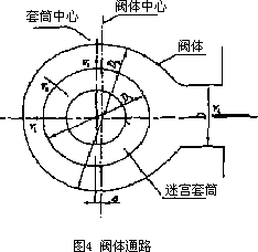 閥體通路設(shè)計(jì)時(shí),首先要根據(jù)閥門(mén)通徑D(見(jiàn)圖4)選定迷宮套筒的尺寸D1,然后再設(shè)計(jì)D2。對(duì)小口徑(小于50mm)閥門(mén),套筒中心與閥體中心同心。而對(duì)于50mm以上閥門(mén),則最好將套筒中心與閥體中心偏心設(shè)計(jì),通過(guò)偏心量e來(lái)控制從迷宮套筒內(nèi)流出的各個(gè)方向流體的速度(液體的運(yùn)動(dòng)方向相反)。使V1>V2>V3,這樣各路流體到達(dá)閥出口處時(shí),其運(yùn)動(dòng)速度就基本一致,從而避免產(chǎn)生渦流。