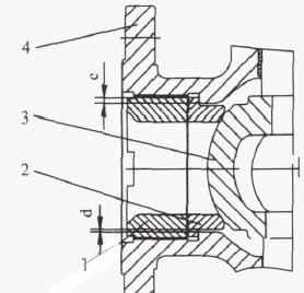 (2)閥座與閥體間的密封采用硬密封結構,適合高溫、高壓工況。閥座與閥體密封接觸面尺寸c值小,各自密封面精度要求高,在裝配時,護圈用電動沖擊扳手安裝,不僅是護圈與閥體嚙合,防止松動,而且是閥座摩擦轉(zhuǎn)動,符合機械振動嚙合原理,使閥座與閥體可靠密封。