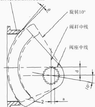 氣動(電動)雙偏心半球閥(圖1)的半球體采用雙偏心設計,密封效果可靠,瞬間脫開,力矩小,使用壽命長。可應用在輸送顆粒類介質(zhì)的苛刻工況中。其結構原理是半球體(圖2)中線與閥桿中線偏置尺寸a,與閥座中線偏置尺寸b,全開時球體與閥座完全脫開,并有一定的間隙,回轉(zhuǎn)半徑分為長半徑和短半徑,在長半徑轉(zhuǎn)動軌跡的切線會與閥座密封面形成一個θ角,在閥門啟閉時,半球相對閥座面有一個漸出脫離(如圖在開度10°時,芯已經(jīng)完全脫離)和漸入擠壓的作用,從而降低了啟閉時閥座與半球之間的機械磨損和擦傷,提高了使用壽命。