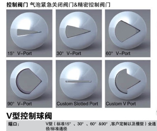 氣動V型球閥是一種90度旋轉(zhuǎn)的高級控制閥,其主要作用為調(diào)節(jié),也可做為開關(guān)閥使用,V型球閥閥芯設(shè)計成帶有特殊形狀V型缺口,具有很強的剪切能力及自潔能力。尤其適用于纖維和含有固體的微小顆粒。全V形切口球體旋轉(zhuǎn)控制閥驅(qū)動軸球體系列,改進了節(jié)流口設(shè)計,提高了控制精度,延伸了小流量控制功能。 氣動V型球閥球芯形狀: 氣動V型球閥流量特性圖: