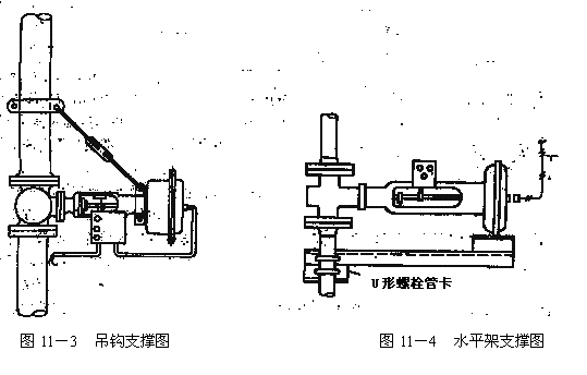 如果管道是垂直的,調(diào)節(jié)閥非水平安裝不可,則要用吊鉤或拉條把執(zhí)行機構(gòu)支撐在管道上(圖11-3);或者用U形螺栓管卡和支板把調(diào)節(jié)閥支承起來(圖11-4)。這樣就可以消除熱膨脹的影響。但是,這種安裝還是有一定危險的,特別是在工作條件惡劣的情況下。安裝過程中一定要把氣動流量調(diào)節(jié)閥緊固在管道上,使閥門和管道連同執(zhí)行機構(gòu)都支撐在同一鋼架上,這樣安裝的閥門應(yīng)力最小。不管采用哪一種固定或支承形式,都要考慮到熱應(yīng)力和振動的影響。