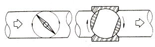安裝旋轉(zhuǎn)式閥門時,閥桿水平安裝是理想的位置,這樣可以防止管道低處的沉積物進入軸承。由于閥門關(guān)閉時流體中的固體顆粒沉積下來,因此,球閥和蝶閥的打開方向要有利于排開這些固體,也就是說,蝶閥的閥板和球芯轉(zhuǎn)動時應(yīng)該從底部向上轉(zhuǎn)動(圖11-5)。旋轉(zhuǎn)式閥門同樣要裝在有空間位置和維修方便的位置。