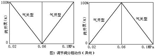 分程控制系統(tǒng)中,氣動薄膜調(diào)節(jié)閥的開閉形式,可分同向和異向兩種,見圖2和圖3。
