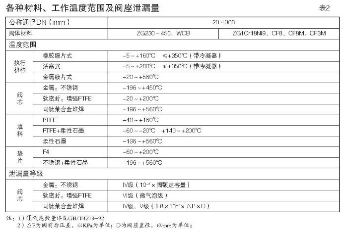 二、自力式壓力調(diào)節(jié)閥的各種材料、工作溫度范圍及閥座泄漏量: