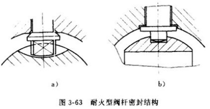 3-63為耐火型閥桿密封結(jié)構(gòu);一旦失火,軟質(zhì)填料被燒毀或軟化,閥體體腔內(nèi)的流體壓力將閥桿推向閥體閥桿上的臺(tái)肩被閥體擋住,并藉高壓流體壓力作用壓緊而密封;此外,它還能防止腔內(nèi)異常升壓時(shí)閥桿沖出體外。