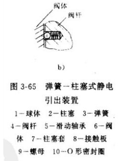 圖3-65a所示為彈簧一柱塞式靜電引出裝置。壓縮彈簧加載于柱塞,使球體與閥桿以及閥桿與閥體之間形成靜電通道。這樣,因摩擦產(chǎn)生的靜電便通過(guò)彈簧一柱塞傳到閥桿和閥體,從而通過(guò)管道與地接通,達(dá)到消除靜電積累之目的。