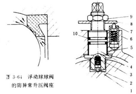 對(duì)于固定球球閥;可采用圖3-22和圖3-24所示彈性閥座。當(dāng)閥體體腔內(nèi)壓力異常升高時(shí),將反向推動(dòng)閥座后退使之與球體脫離接觸。流體則沿著閥座與球體之間的間隙流出,消除過(guò)壓現(xiàn)象。