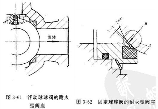 3-61為浮動(dòng)球球閥的耐火型閥座密封結(jié)構(gòu)。一旦失火,其高分子材料閥座被燒毀,球閥的球體在流體壓力作用下,就會(huì)向閥后閥座方向推進(jìn),使之與加工成直角的閥體閥座槽金屬座面接觸。起到臨時(shí)和部分密封作用.避免災(zāi)情進(jìn)一步擴(kuò)大。