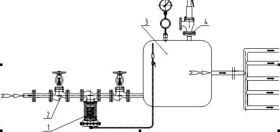 管道配置:1、自力式壓力調(diào)節(jié)閥 2、截止閥 3、儲氣罐 4、安全閥